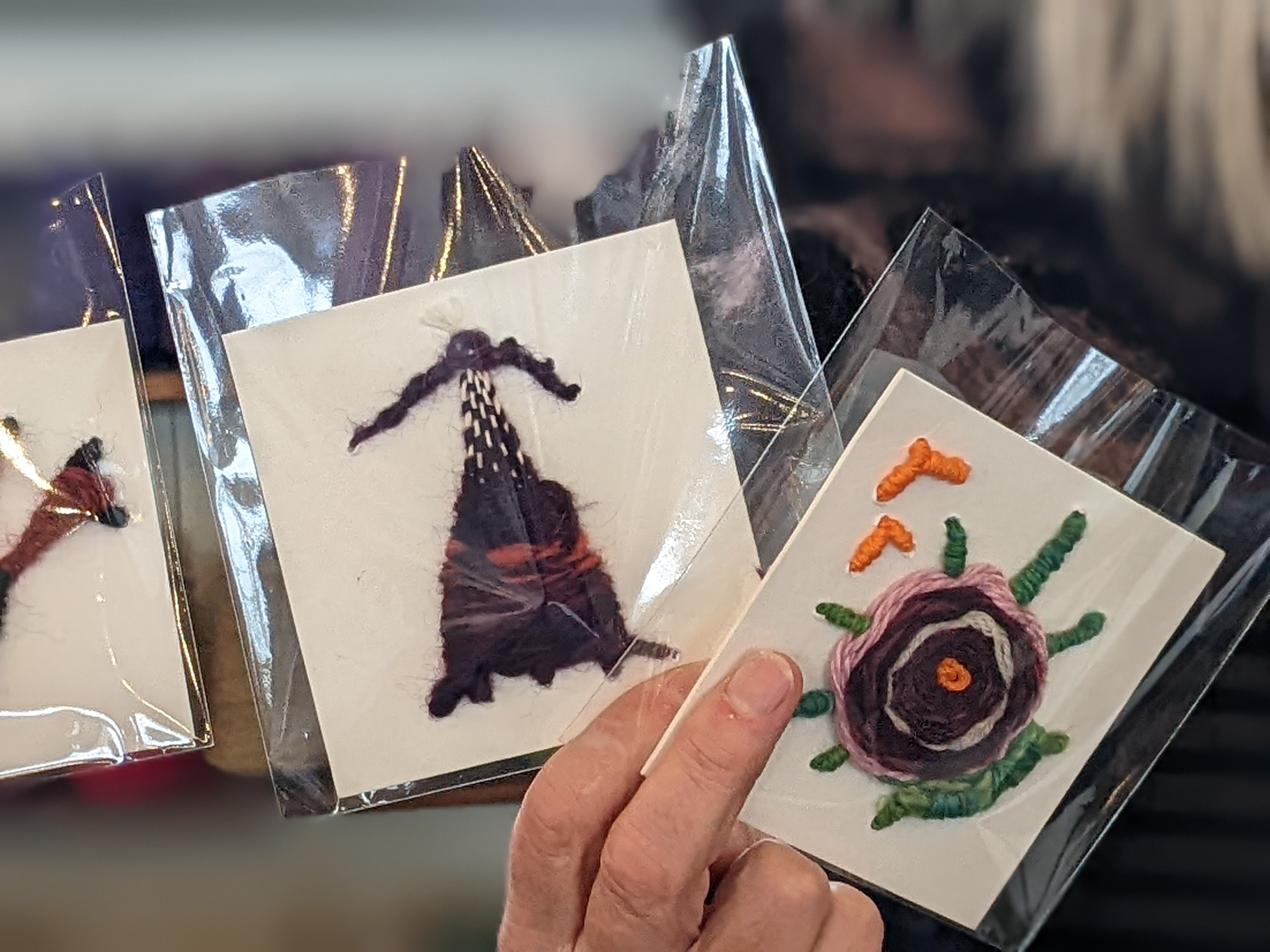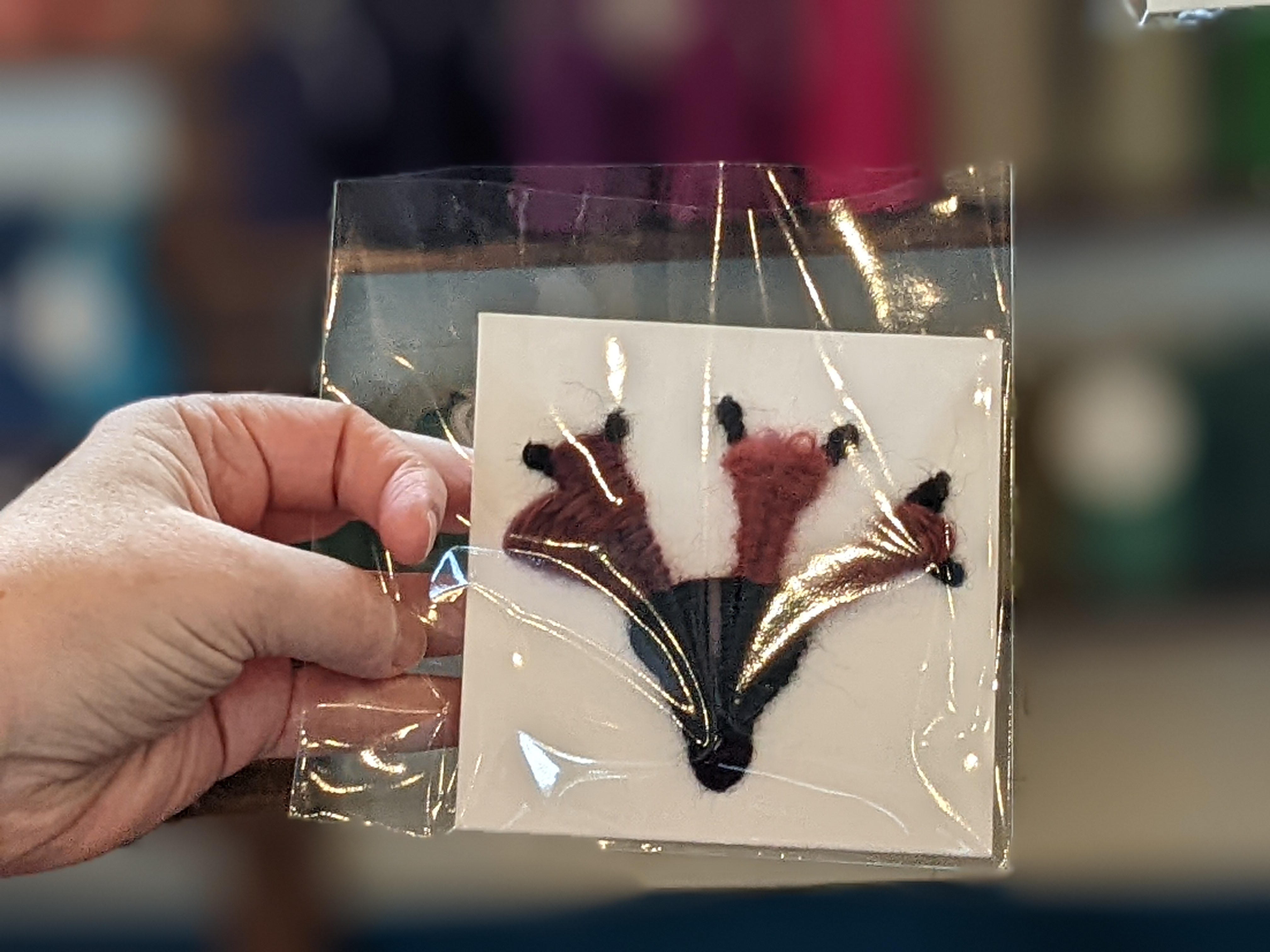 With an easy to build circular cardboard loom, Sherron taught us how to create a small weaving. We learned a transportable, fun and easy way to weave and share our love of weaving with others. Lisa and Suzy expanded on the workshop by creating a small woven basked and pins.