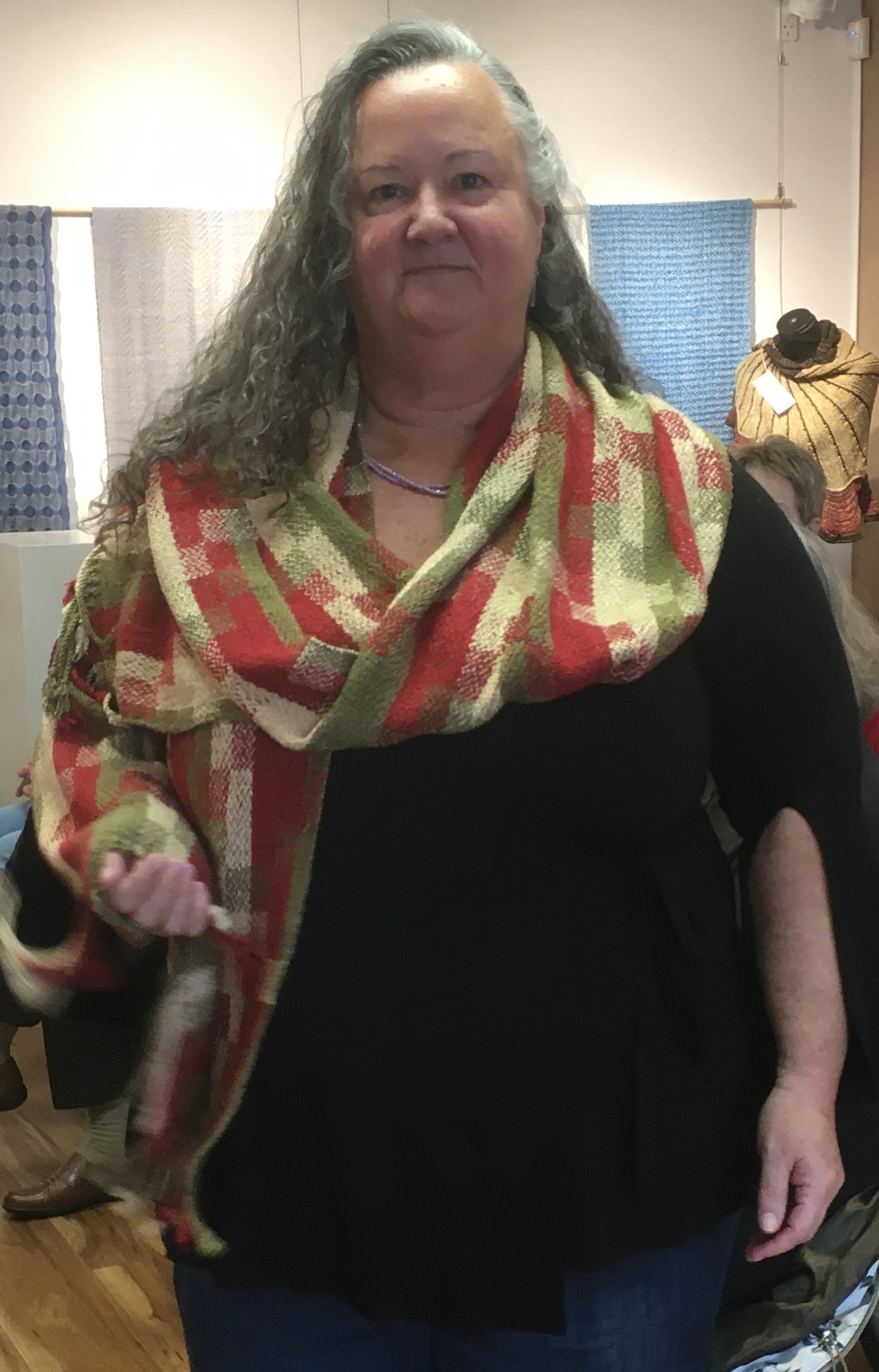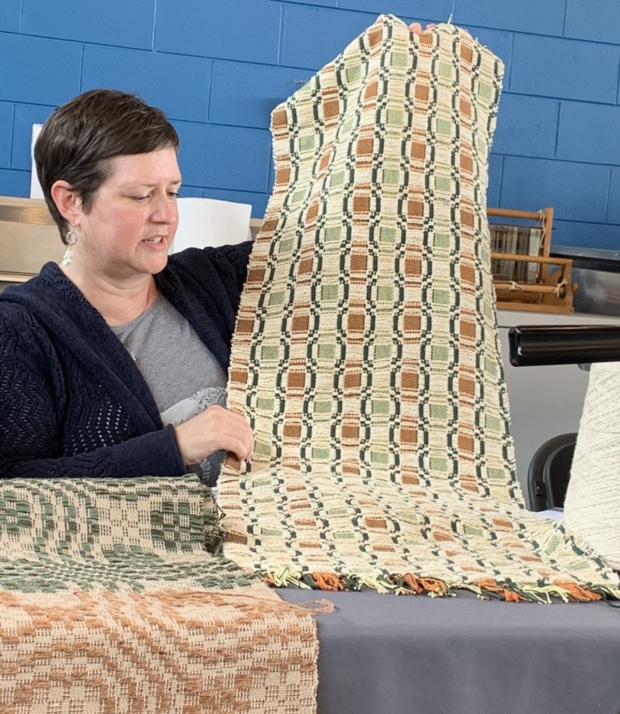 Tammy Deck, an award-winning fiber artist, Tammy Deck, fiber artist, teacher, owner of TLD Designs in Westmont and Berwyn, Illinois, gave an interesting and inspirational presentation on her of “waste” materials or reusing materials in her fiber arts. The workshop continued the theme of sustainability with a Thrumori Weaving workshop.