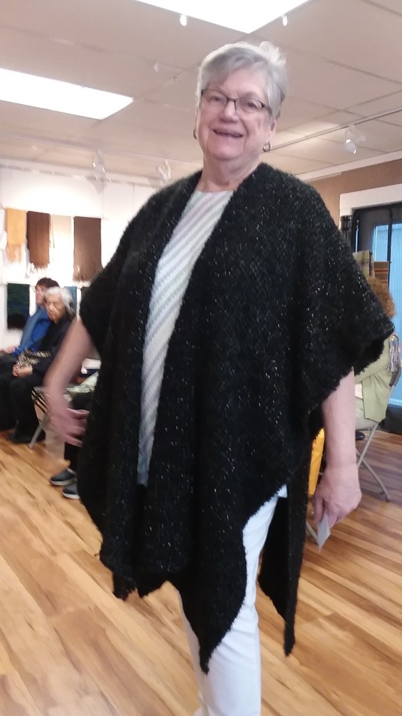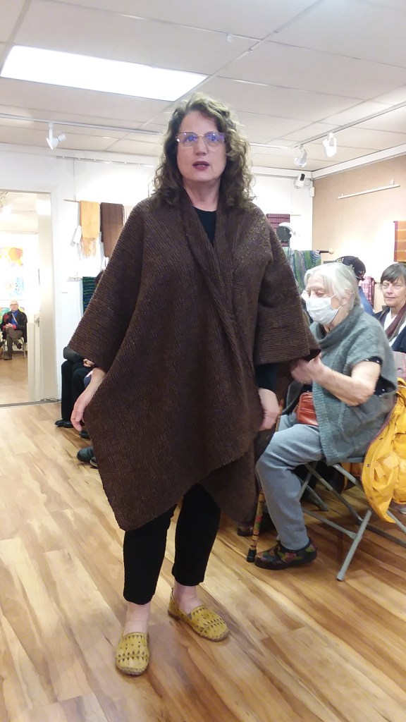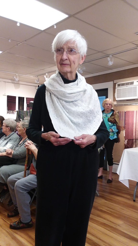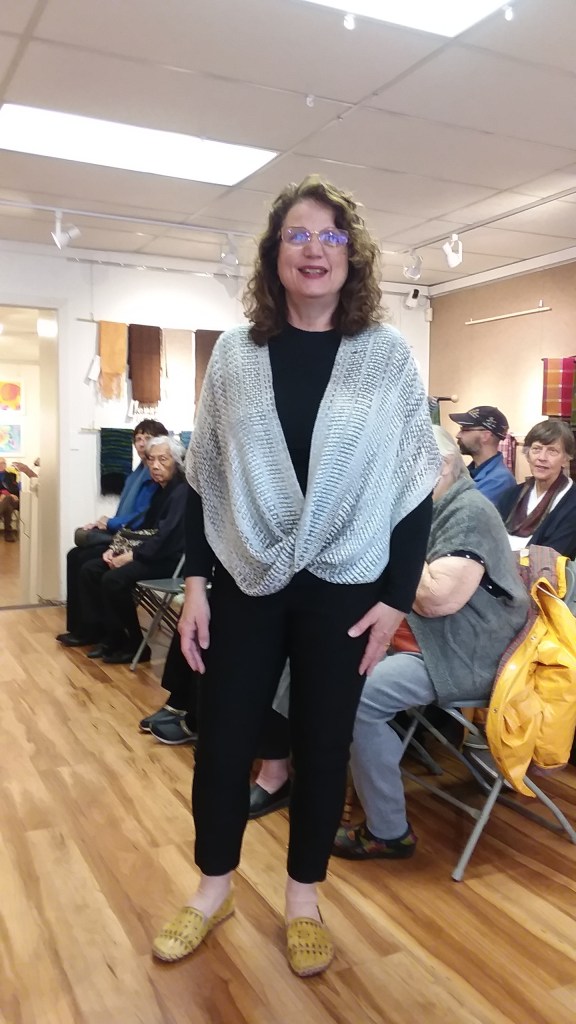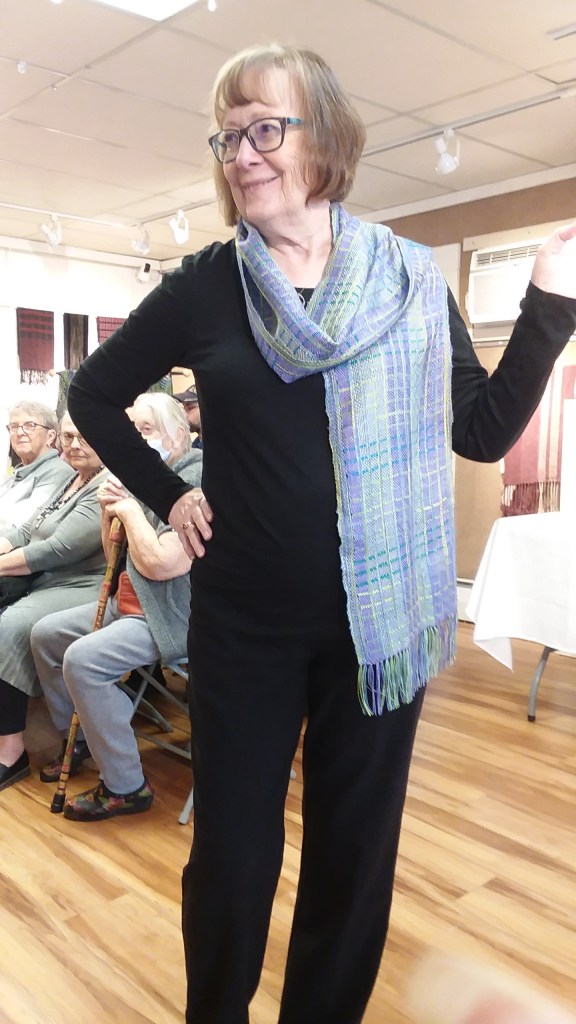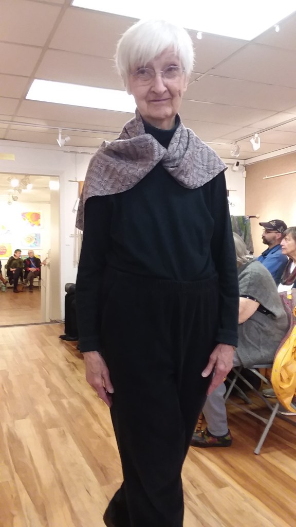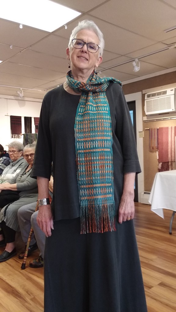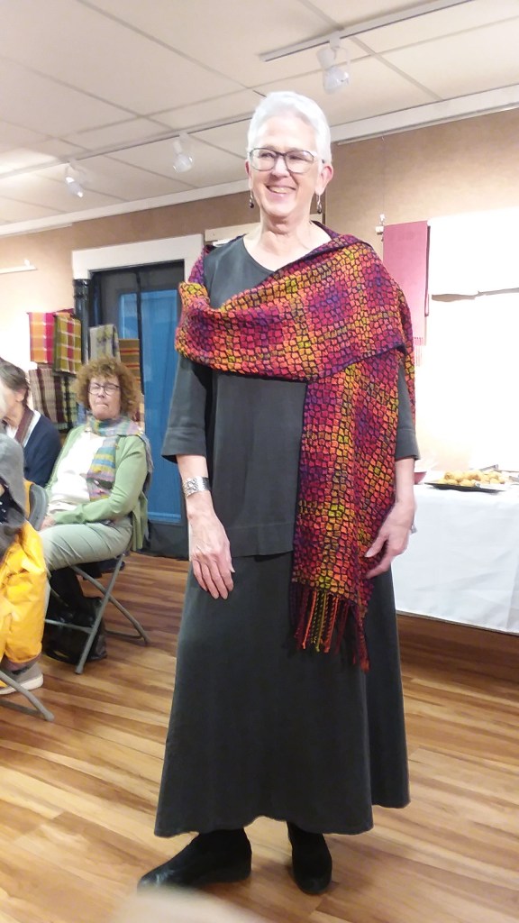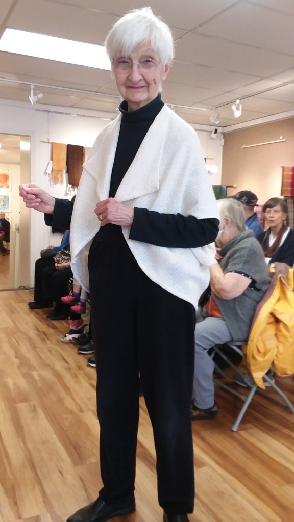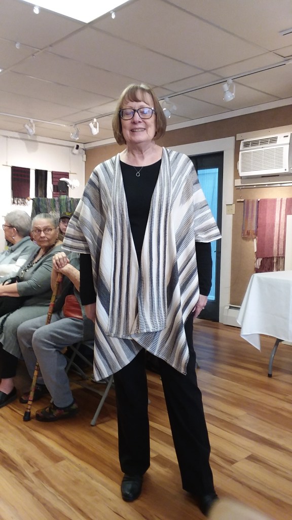 Each spring the Duneland Weavers’ Guild presents an exhibit of members’ weaving and other fiber art at the Chesterton Art Center. The exhibit opens with a reception and style show. The images below show members and friends modeling our guild members’ work. Go further down the page to see some images of the displays at the show. Double click any image to see a larger version of the photo.