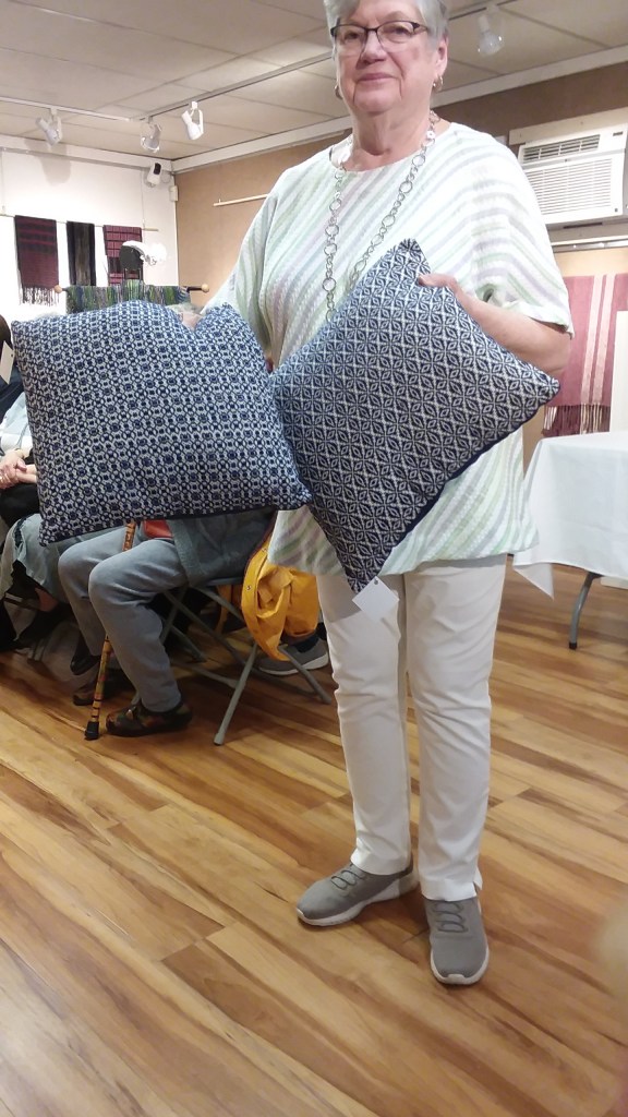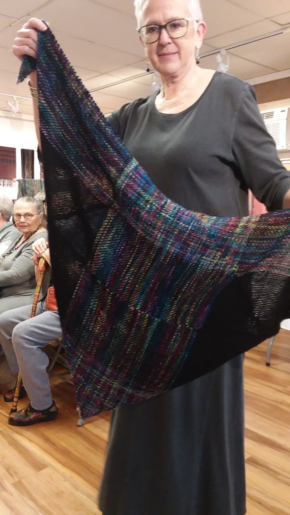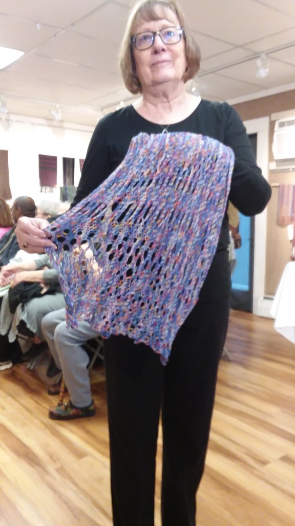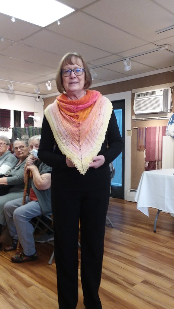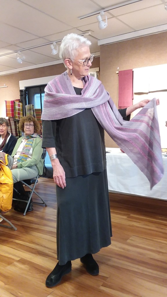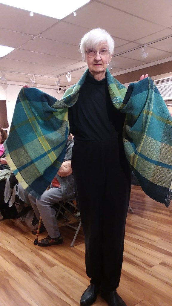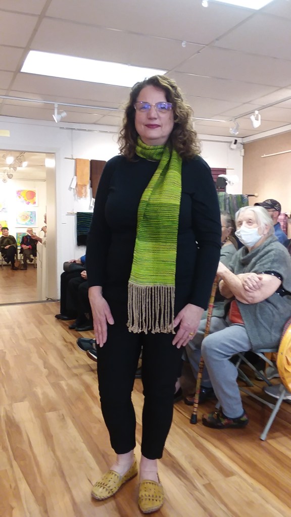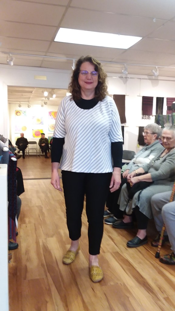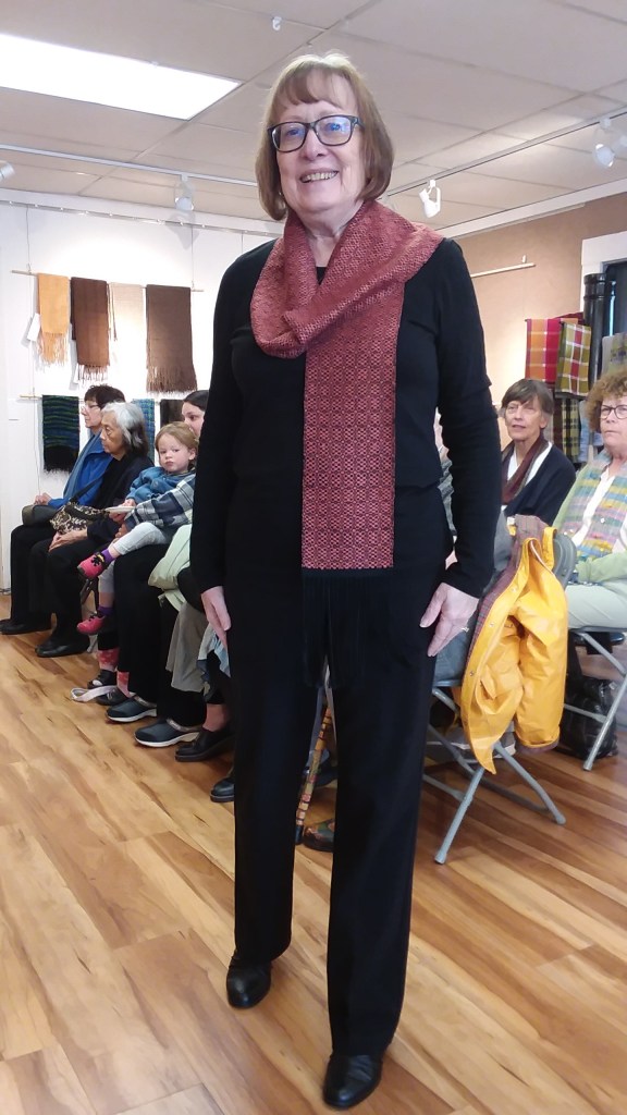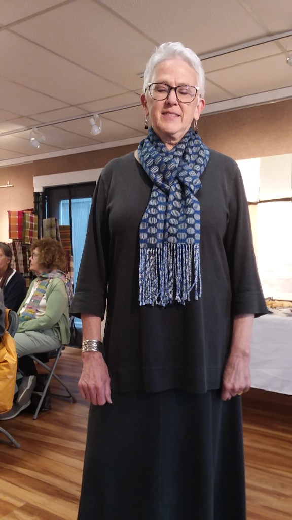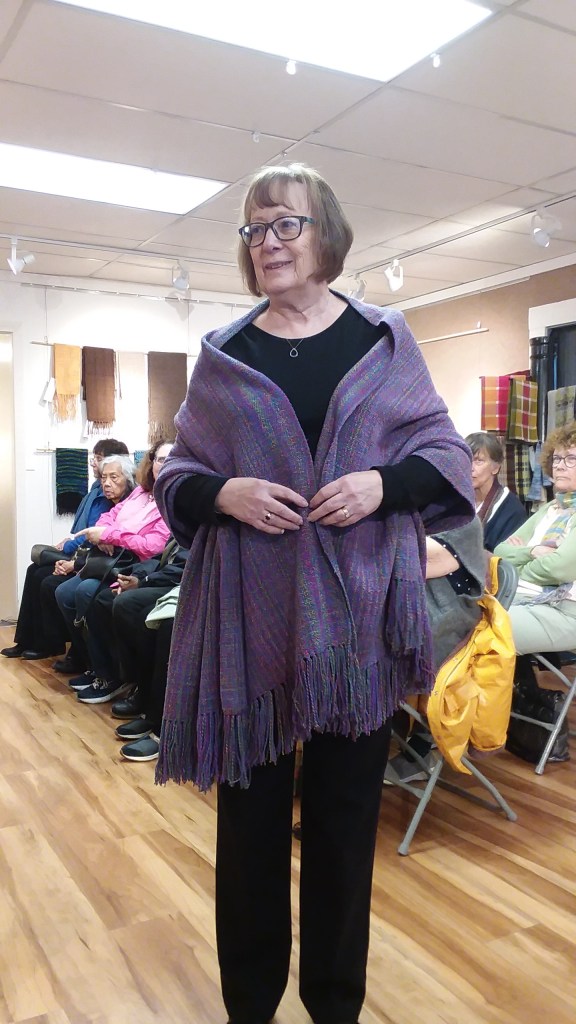 Each spring the Duneland Weavers’ Guild presents an exhibit of members’ weaving and other fiber art at the Chesterton Art Center. The exhibit opens with a reception and style show. The images below show members and friends modeling our guild members’ work. Go further down the page to see some images of the displays at the show. Double click any image to see a larger version of the photo.