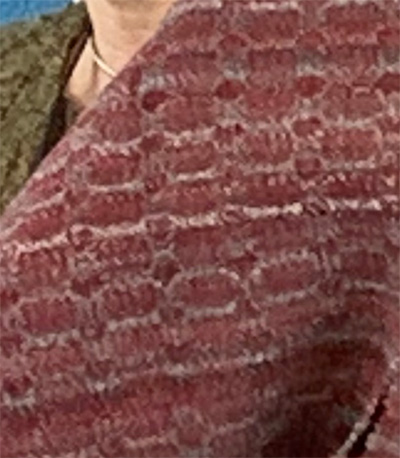 Margaret’s cards specified weave a piece with beading, in undulating twill, warp-faced, add a novelty and use two dye lots of the same color. Margaret eliminated “warp-faced” and wove three shawls in an undulating twill. In the photos above is her elegant undulating twill shawl that has beads on the fringe, the novelty of metallic gold weft, and two slightly different shades of gold in the weft that are discernible in the photos if you look closely.Margaret’s other two undulating twill shawls are shown above. On the left with a variegated weft and on the right with a 5/2 cotton warp and slubby cotton weft.Rebecca drew cards that specified that she use weft yarn from her stash, Ms and Os, sett no less than 20epi, with small geometric shapes, and analogous colors of the same value. This was her first opportunity to do a weaving of her own since opening Three Moons, and to meet her challenges, she wove this very attractive scarf in a honeycomb variant of Ms and Os weave that produces small circles and ovals. Rebecca’s 8/2 variegated cotton weft yarn was from her stash and contained a purple that was analogous to, and close in value to, her rich red violet warp which she set at 22epi.