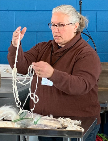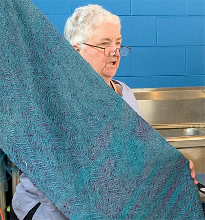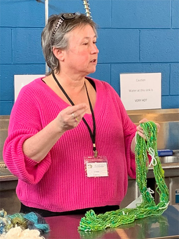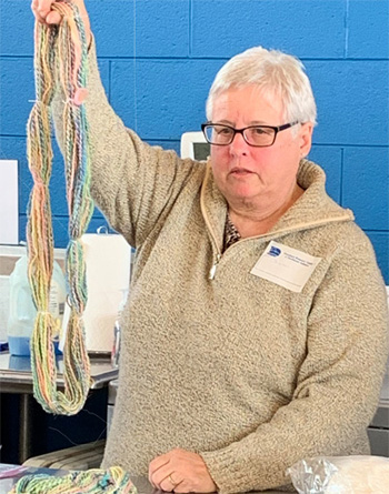 Donna’s card challenged her to spin a botanical fiber (flax, hemp, nettle, rose fiber, etc.) and create a texture in the yarn without adding new fiber. On the left she is holding pineapple fiber yarn she spun and on the right, rose fiber or hemp yarn. She concluded that flax and hemp yarns were relatively rough and easy to add texture to while rose fiber was very slippery and fine, making it hard to add texture . Pineapple fiber was intermediate, soft and smooth and able to hold texture. She was most impressed with the texture and interest of yarn in which she spun all the fibers together.Leah drew two cards that challenged her to spin mohair as thinly as she possibly could and to dye the fiber before or after spinning it. In the photo on the left, Leah is holding her lovely, impressively thin, 2 ply mohair yarn. She began with mohair locks, spun two very thin yarns which she then plied together and dyed. In the photo on the right is a skein of mohair yarn she spun to show how using different techniques with mohair can create very different types of yarn. For this yarn she first dyed the locks and teased them apart and then spun them around a core yarn. The result is a beautiful, soft and slubby yarn.
