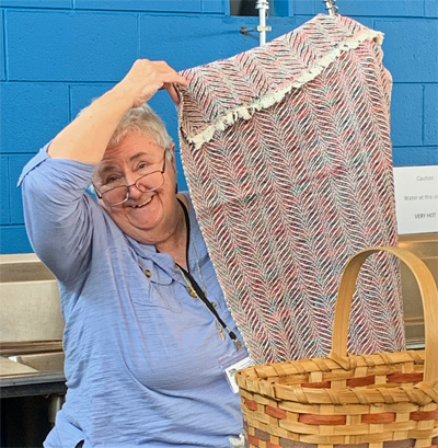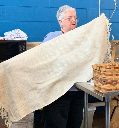 Mandy’s cards challenged her to weave using yarn from the yellow 1/3 of the color wheel, with not less than 20 ends per inch, striped, mixed warp profile and overshot on opposites. She eliminated “overshot on opposites” and chose to use a mixed weft . The very handsomely patterned striped towels and sample above were Mandy’s first 8-shaft projects. The sample she is holding and two of the towels are in shades of yellow and related colors in her mixed weft. She wove them all with with 8/2 cotton warp at 22 epi and used 8/2 cotton and bamboo in her weft.Shelby’s challenge was to weave using a 12 dent reed, with alternate colors, borders and a stretchy texture, and in the form of a gamp or four weaves. She met her challenges with the four very attractive towels in the photo above. Their alternating colors and borders are obvious from a distance. To appreciate the four twill patterns that are in each towel, zoom in if you can. (Combining different twill weaves in a single piece can be very tricky.) Shelby also demonstrated that the towels were slightly stretchy (when pulled on their bias :-).