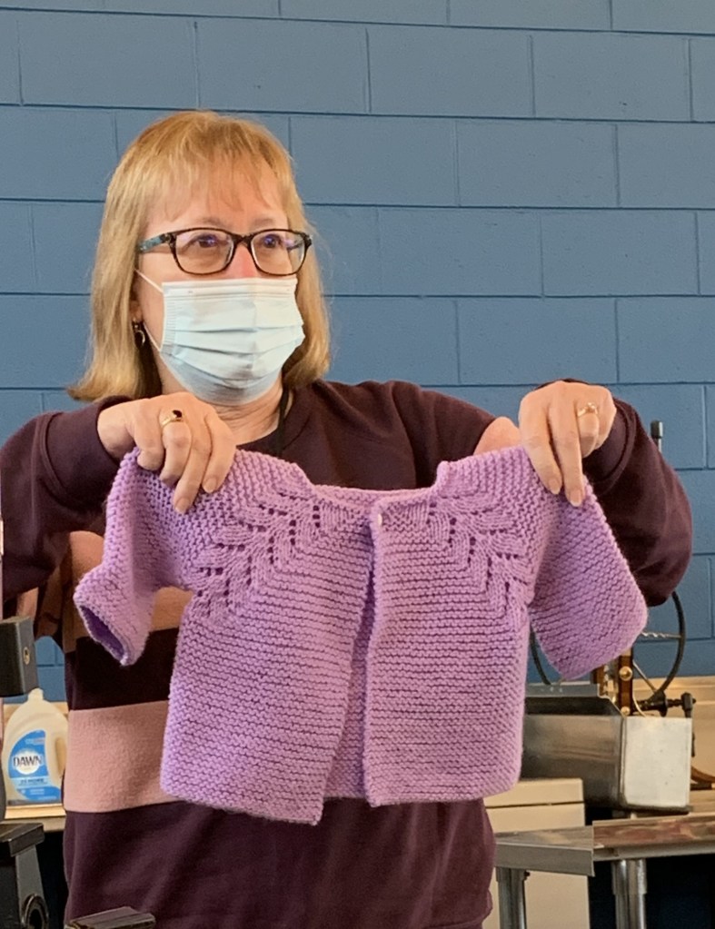 Sue completed another cute baby sweater. What little one wouldn’t be even more adorable in this purple jacket with beautiful detailing at the shoulders.