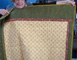 Donna wove this rug with a tie-dyed T-shirt weftDonna wove rugs using clasped weft (top left), in plaid (top right) and using tie-dyed t-shirts as weft (bottom)She also brought a quilt she had made using Voysey fabric squares. In the photo below, she showed us its quilted back.She also brought a quilt she had made using Voysey fabric squares. In the photo on the right she showed us its quilted back.The back and front of a quilt and cotton grown at home!Susan’s first weaving project was a set of 6 placemats woven in twill and tabby using hand-dyed cotton yarn for weft.