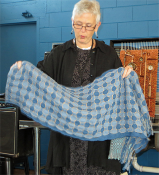 Among the pieces Shelby brought to show us were the wool deflected doubleweave shawl on the left and the Melanie Berg knit shawl on the right.She also wove 2 rugs with clasped weftsDonna wove a plaid rug
